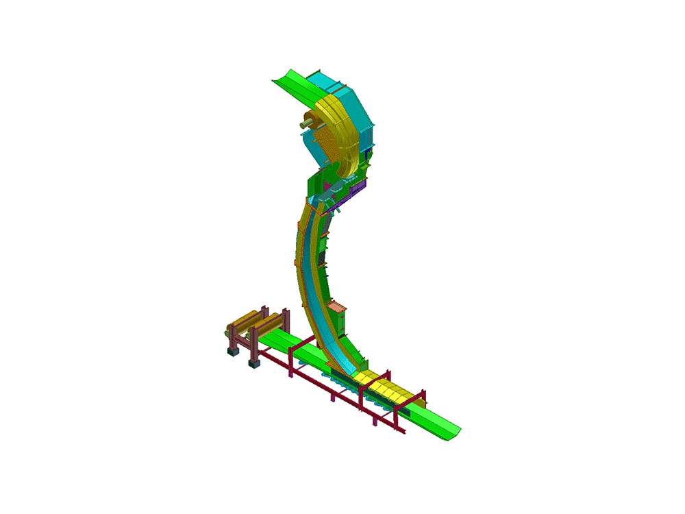 When Chute Technology designs a new transfer chute, as shown in the examples above, we run detailed DEM models to compare the flow, wear, surface temperatures and other factors between the original and the new design. The first image shows a series of DEM models showing the original and new flow. The second is a drafted model of the new chute design, ready to manufacture.