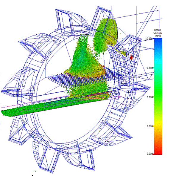 DEM models of bucketwheels, where Chute Technology has worked to optimise flow, improve belt tracking and minimise spillage, belt wear and skirtboard wear.